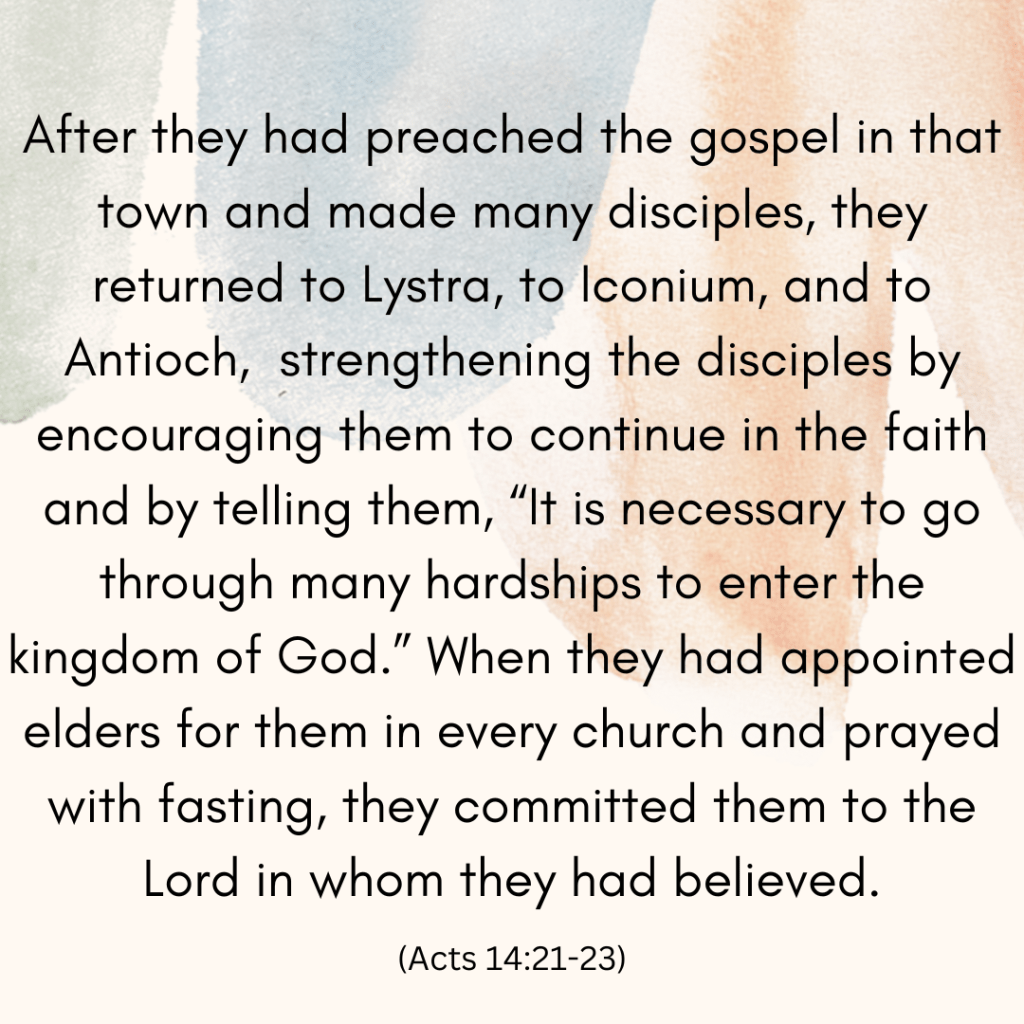The second passage we will look at is Acts 14:21-23. While the Great Commission instructs us on the nature of discipleship, this passage shows us the practice and context of discipleship. There are two stages of practice we can take from Paul’s example in this passage: