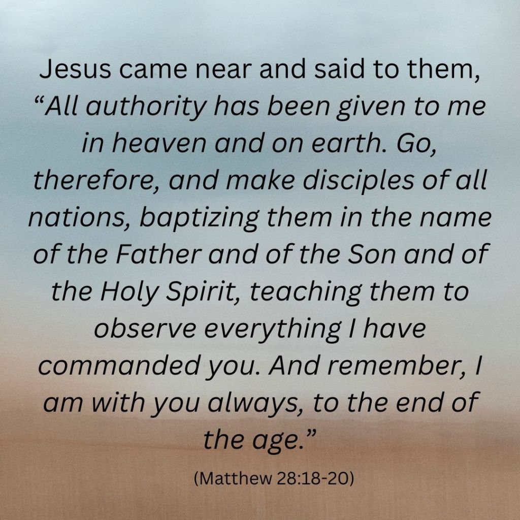 - Discipleship comes with a promise—V21 is Jesus’ promise of His never-ending presence with His disciples as they go and make more disciples. This presence is shown within His gathered people (Matthew 18:20), and in the indwelling of the Holy Spirit to comfort and empower His disciples to fulfill this command (John 14, 16). “The end of the age” refers to the end of time when Jesus will return to gather His followers and judge the unbelievers. By using this phrase, Jesus is not only referring this command, guarantee, instruction, and promise to the 11 Apostles only, but also to every disciple that will be made throughout Christian history until the very end (including us today).